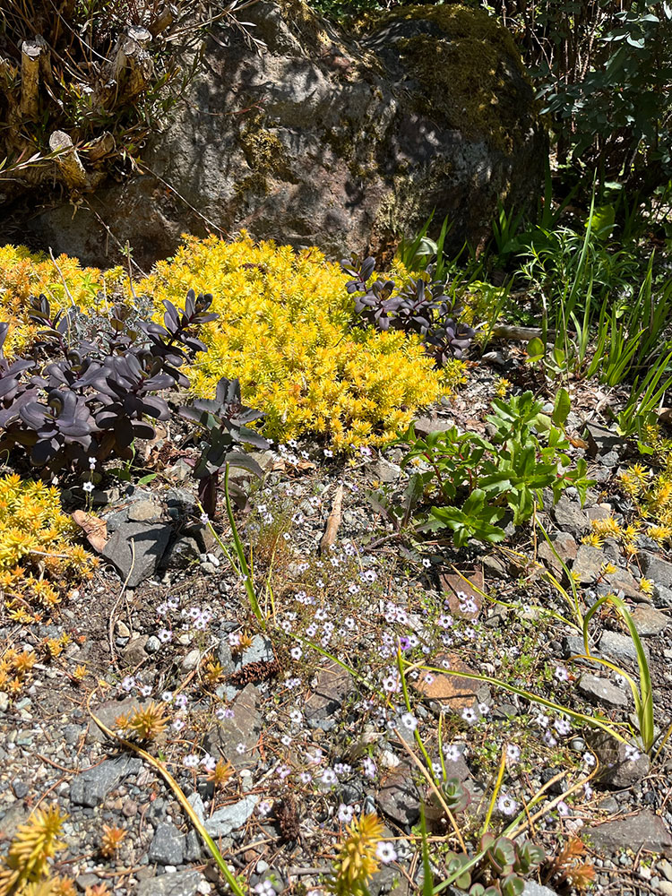 Recently we began trialing a variety of annuals in the garden. We identified spaces with adequate sunlight and either bare soil or gravel. In the Miller Garden those spaces are extremely rare! We bought some annuals which might be more tolerant of light shade, like Collinsia parviflora and Baby Blue Eyes (Nemophila menziesii), but found many of the seeds like Farewell to Spring (Clarkia sp.) and Bird’s Eye Gilia (Gilia tricolor) like ample sun. As these annuals progress some types grow well during early spring until the dry season, like meadow foam (Limnanthes douglasii). Others can actually bloom through summer. Allow these plants to grow their whole life cycle in your garden, then let them go to seed to disperse throughout. For me the softness and naturalistic chaos they add to a garden is pleasing enough. If that alone doesn’t do it for you, know that this diversity of native annuals can attract specialist native pollinators and provide essential pollen and nectar.