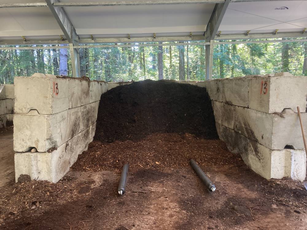 The Compost Facility was completed in March of 2021 and has expanded our capacity, cut production time, improved our compost quality, saved money, and is helping us reduce the spread of harmful plants and diseases. Several bays in our compost facility are equipped with Aerated Static Pile (ASP) technology which allows the composting process to take place without having to turn the piles. Small fans force air through buried pipes beneath the pile and sensors make sure the mixture is “cooking” at optimal temperatures.